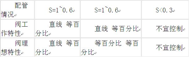 由于系統(tǒng)配管的情況不同,配管阻力的存在會(huì)引起調(diào)節(jié)閥上壓降的變化,從而使流量特性變化。因此應(yīng)根據(jù)系統(tǒng)的特點(diǎn)來選擇希望得到的工作特性,然后再考慮配管情況來選擇相應(yīng)的理想特性。流量特性與配管情況對(duì)照如下:(S:稱為閥阻比,指調(diào)節(jié)閥全開時(shí)閥前后壓差ΔPmin與系統(tǒng)總壓差ΔP之比。)